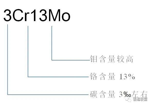 说明:一般前面的阿拉伯数字表示碳含量的千分数,含量小于0.1%时,用0表示;大于0.01%小于0.03%时,用03表示极低碳含量;小于0.01%时,用01表示含碳量。如3Cr13Mo中,表示含碳量为3‰,铬含量为13%,同时钼含量较多。