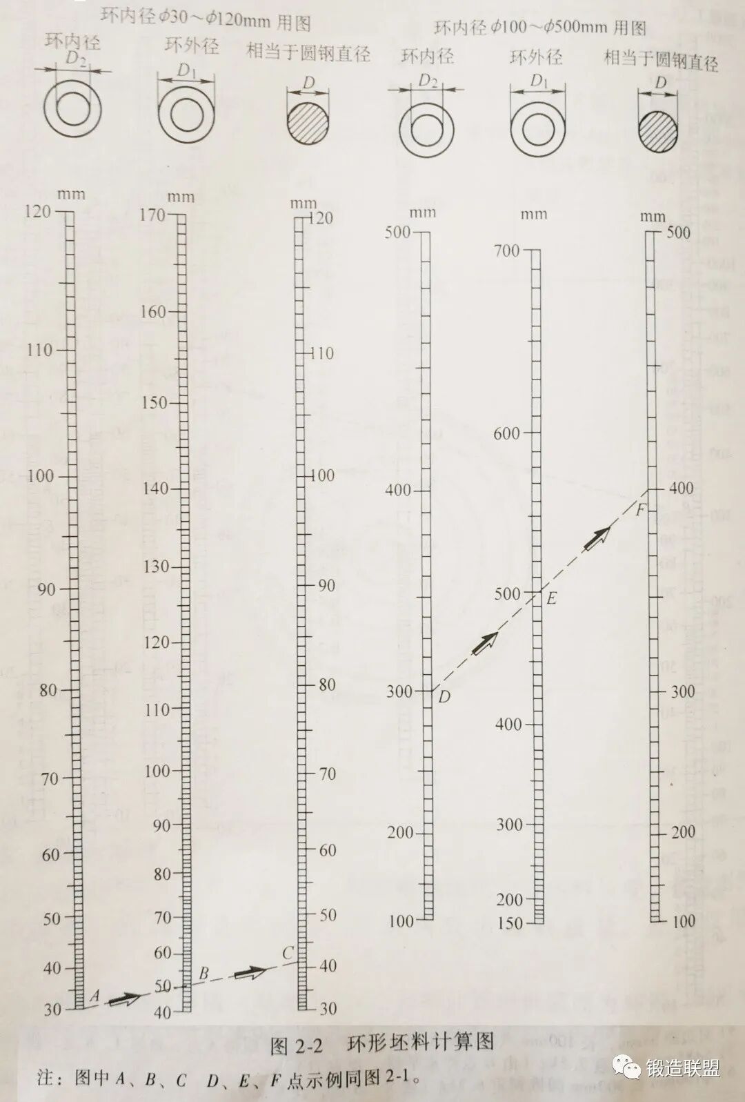 2. 环形坯料计算图。根据环形截面坯料的截面直径,查出坯料的质量。