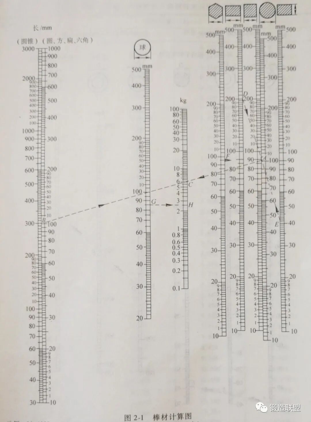 棒料计算图。根据横截面尺寸及坯料长度,按照图例的方法,用细线或直尺比齐,查出对应坯料质量。图表中仅限于碳钢。
