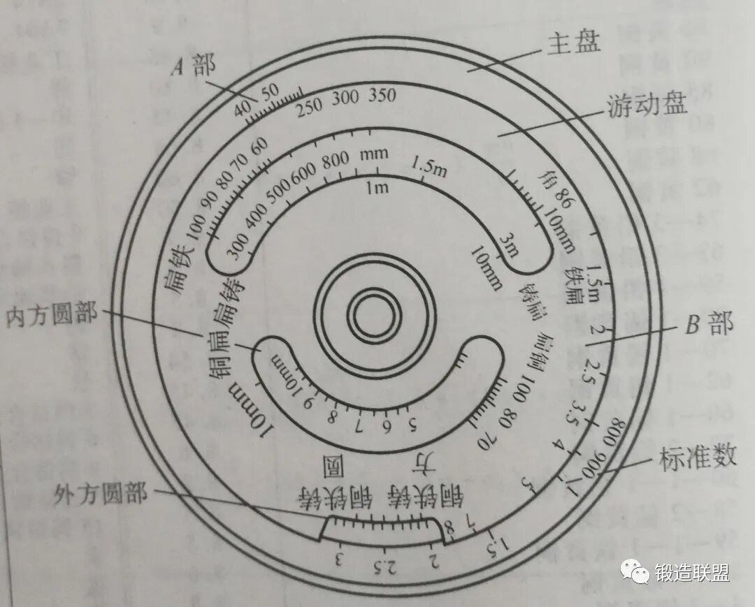 算料盘过去是锻工经常用到的算料工具。利用算料盘可以算出坯料的质量和锻件的尺寸,还可以进行乘除计算。
